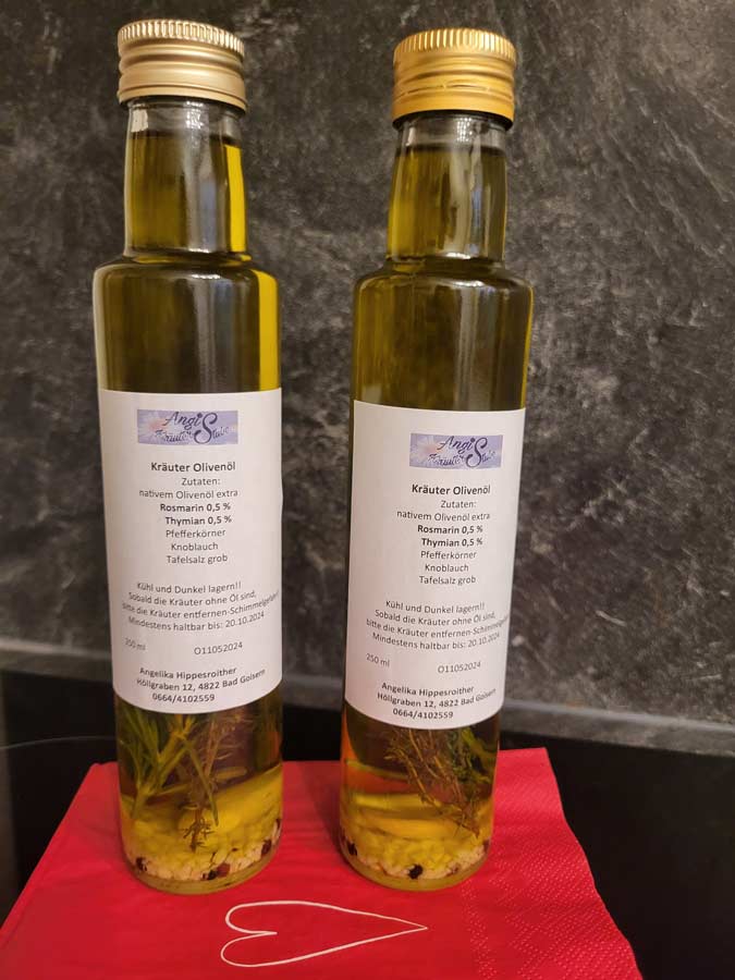 Zutaten:Natives Olivenöl ExtraThymian, Rosmarin, Knoblauch, Pfefferkörner, grobes Tafelsalz